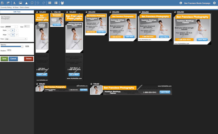 Banner Cloud, a web based banner ad generator and wysiwyg editor that offers the user the ability to create image ad sets from templates and edit several image ad sizes at once. An active user base of over 1,500 have used bannercloud.com to create over 60,000 image ads.